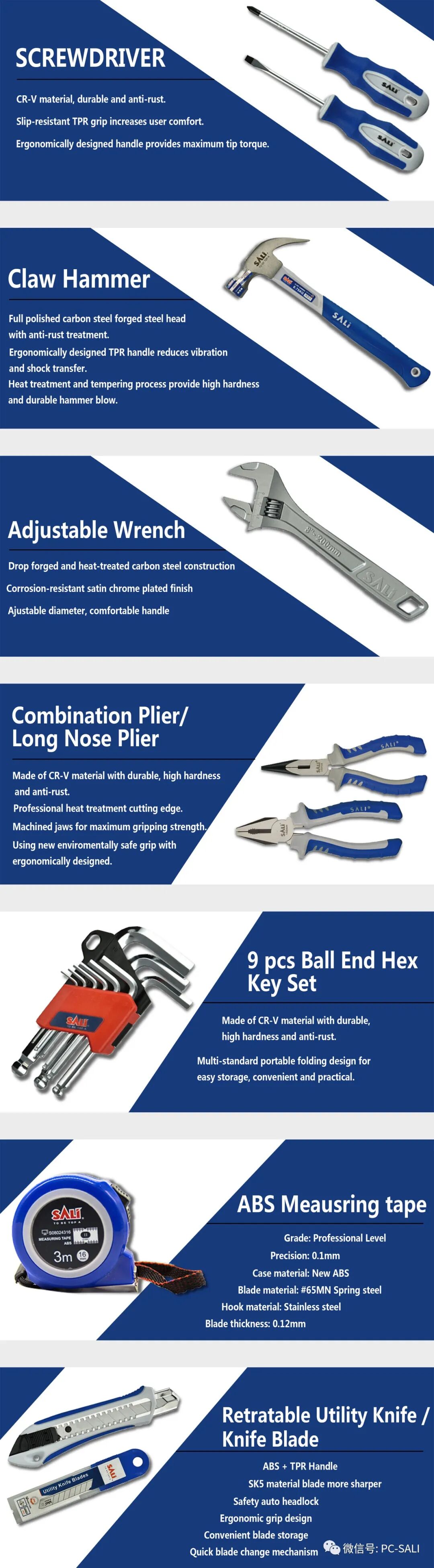SALI tengdir munir, skrúfjárn, hamar, tangir, tól fyrir hnífapör, mælibönd, rækjujárn.